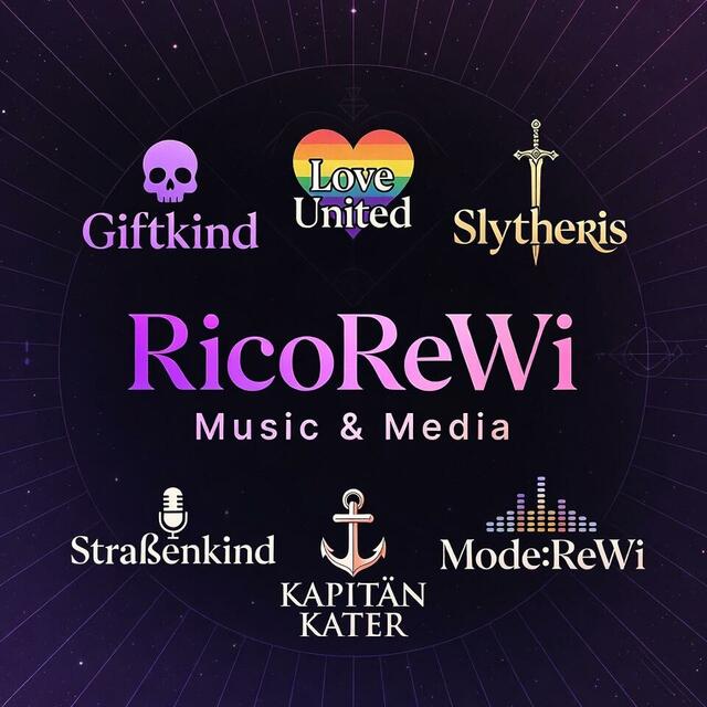 „RicoReWi Music & Media Künstlerradio – dein 24/7 Live-Stream auf laut.fm mit allen unseren Acts: Giftkind, Love United, Straßenkind, KAPITÄN KATER, Mode:ReWi & Slytheris. Düster, proud, epic, street, schlager & cinematisch – pure Vielfalt!“.